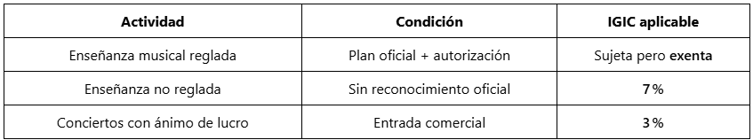 La correcta aplicación del IGIC en Canarias es un aspecto clave para academias de música, gestores culturales y autónomos del sector artístico. La Consulta Vinculante n.º 2.230 de la Agencia Tributaria Canaria (24/11/2025) establece criterios precisos sobre dos actividades habituales: la enseñanza musical y la interpretación en conciertos.
